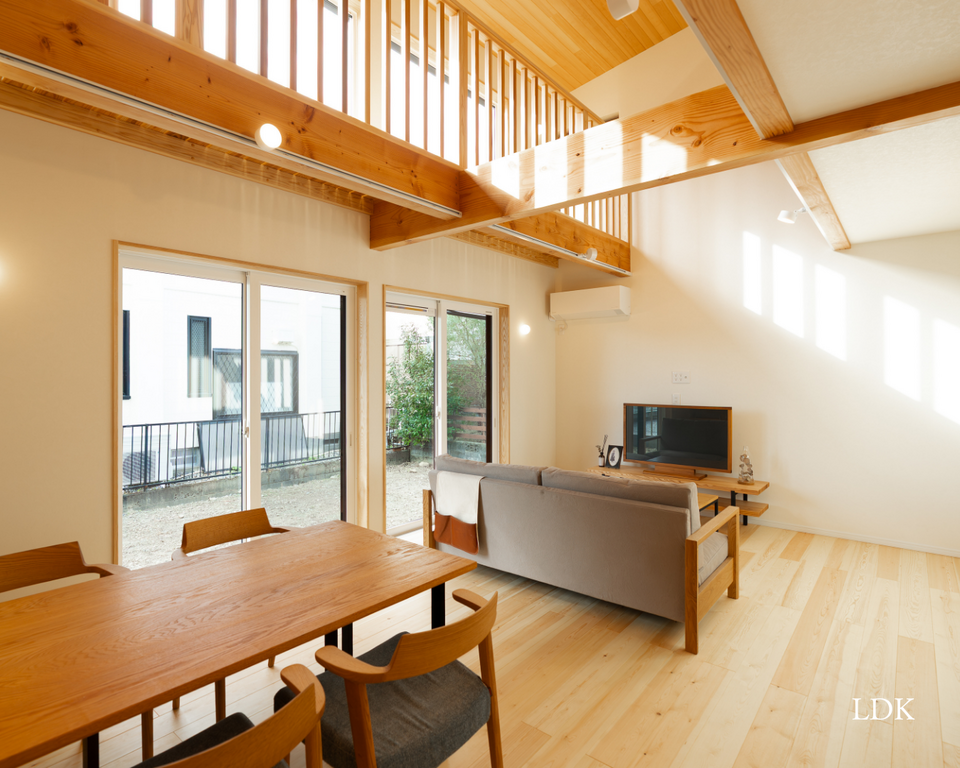 リビングには2階の窓から明るい陽の光が降り注ぎ、吹き抜けを通して照らします。