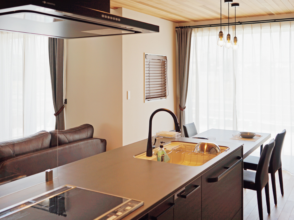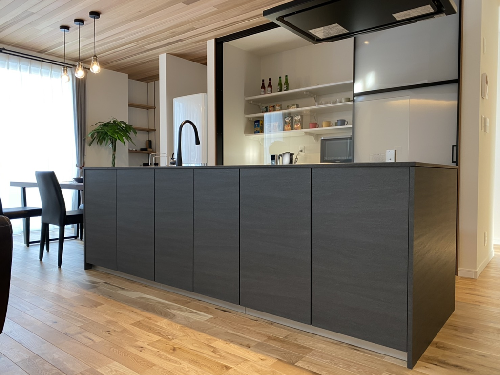 キッチンはグレーストーンの扉とブラックの天板で統一されたシックなデザイン。