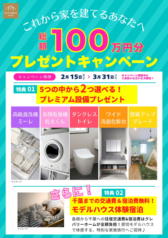 「千葉までの交通費&宿泊費無料!モデルハウス体験宿泊」の豪華ご成約特典!!