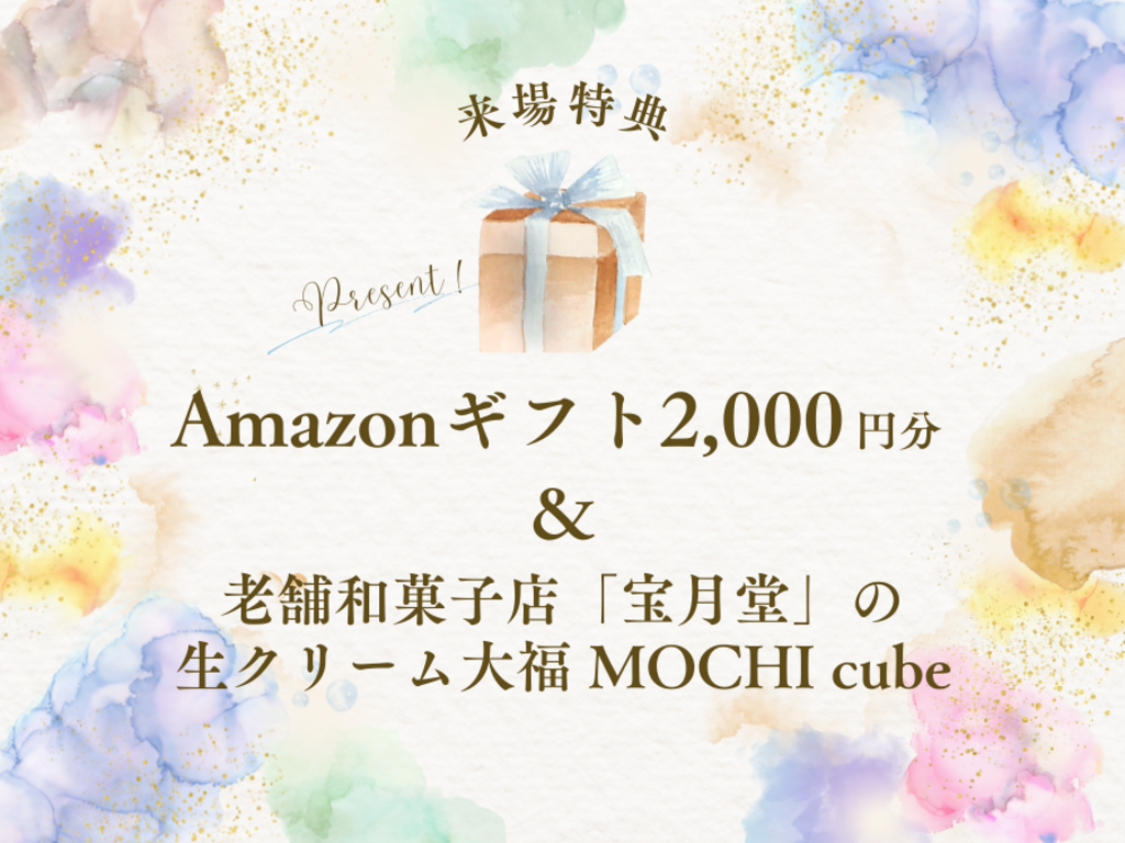 ご予約のうえご来場いただいた方に、Amazonギフト2,000円分と、老舗和菓子店「宝月堂」の生クリーム大福 MOCHI cubeをプレゼント。