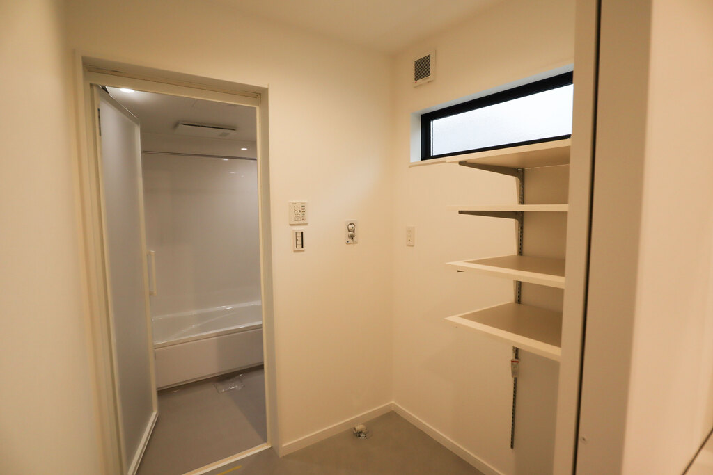 洗面→脱衣→室内干し→バルコニーへ直線につながる動線で、家事のムダがゼロ。忙しい共働き家庭にうれしい設計です。