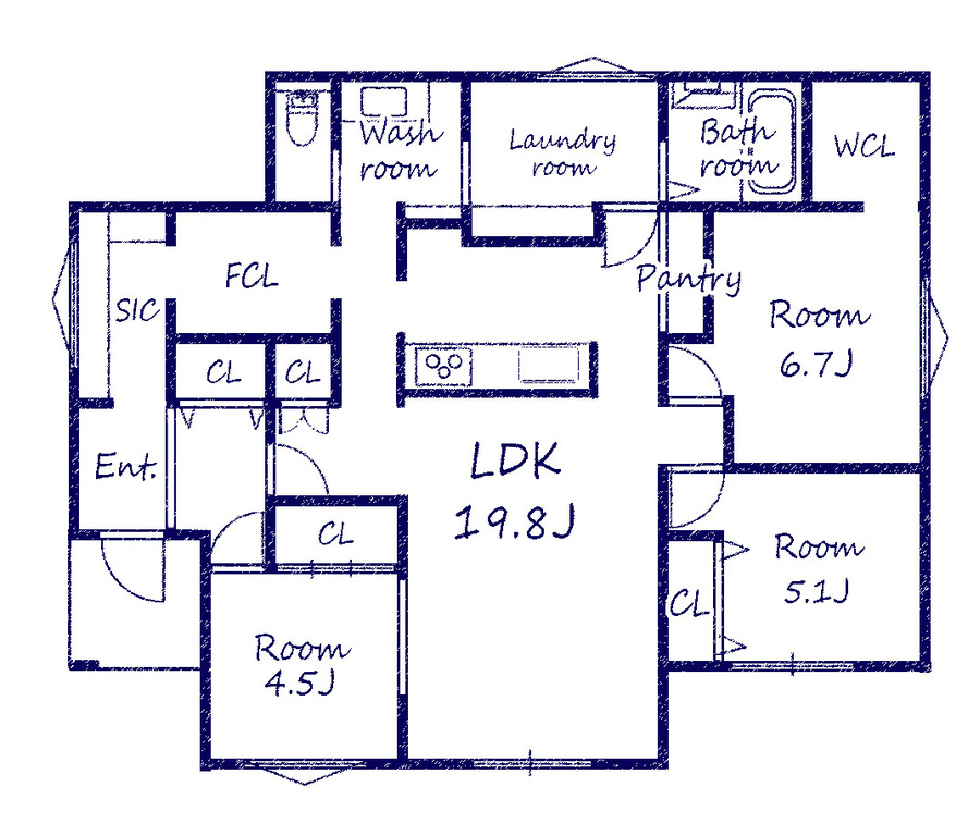 玄関横にはシューズインクローク(SIC)とファミリークローク(FCL)を配置し、 靴やアウトドア用品、コート、ランドセル、部活動の道具など、 外で使うものをまとめてしまえるように計画しています。