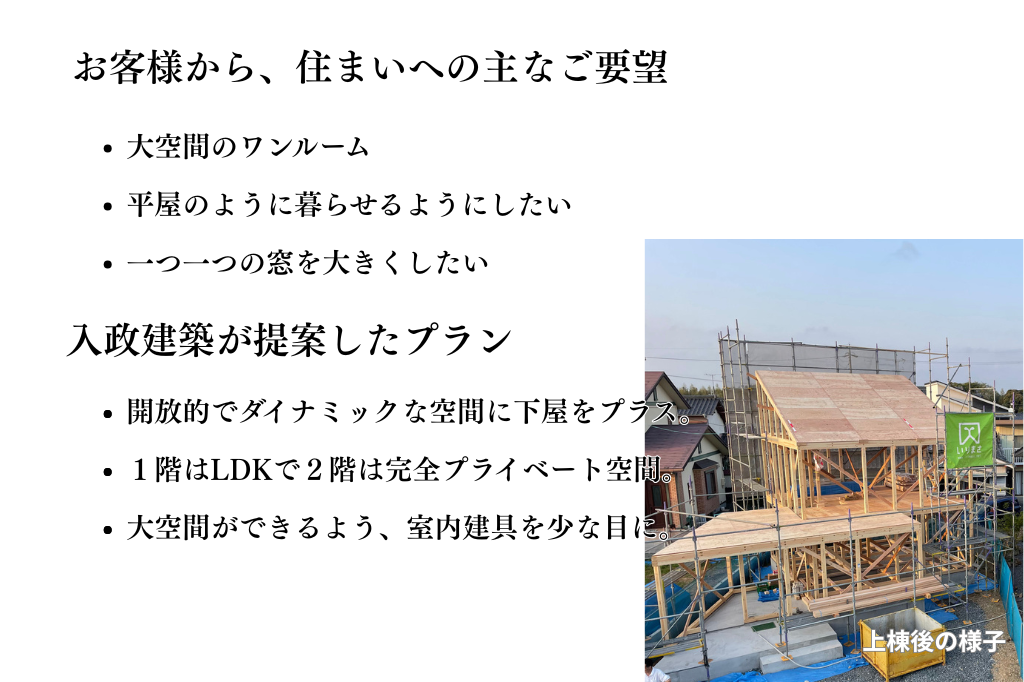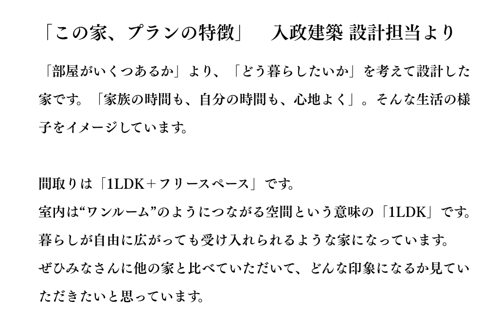 ワンルーム(1LDK)のプランになったのは、「部屋がいくつあるか」より「どう暮らしたいか」を考えて設計したためです。「家族の時間も、自分の時間も、心地よく」。そんな生活の様子をイメージしています。暮らしが自由に広がっても受け入れられるようなこのaisuの家を、どう感じていただけるか、ぜひゆっくり見学していただきたいです。