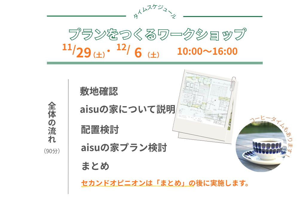 そんなあなたに、入政建築の設計士が敷地に合わせてその場でプランニング!「自分だけの特別な空間」を設計する様子をご覧いただけます。また、お手持ちの図面を入政建築の設計士が、aisuの家のルールでチェック(セカンドオピニオン)も実施します!