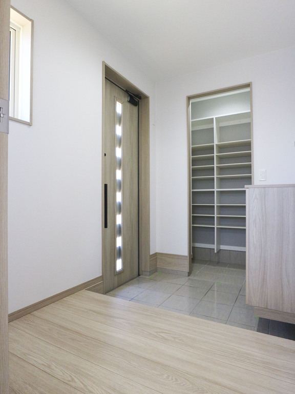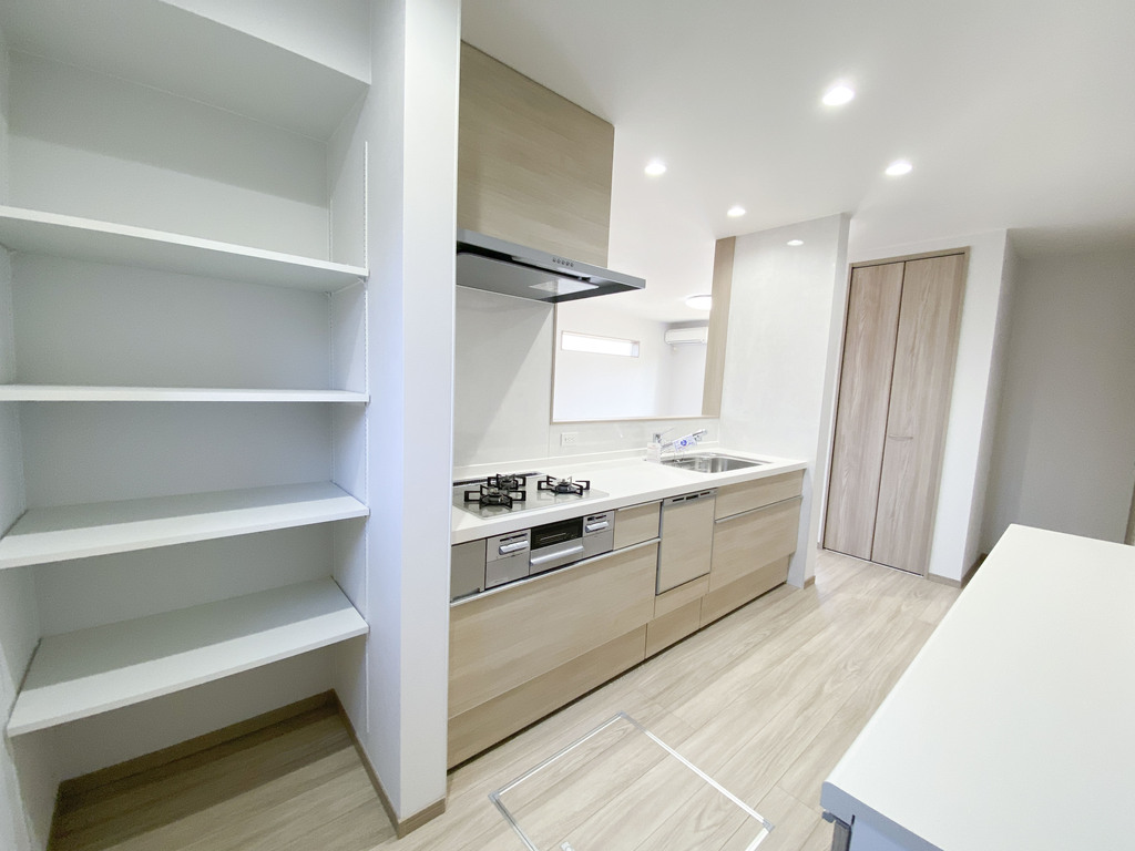 家族と会話が弾む対面キッチン。棚付きパントリーや食器洗い乾燥機付