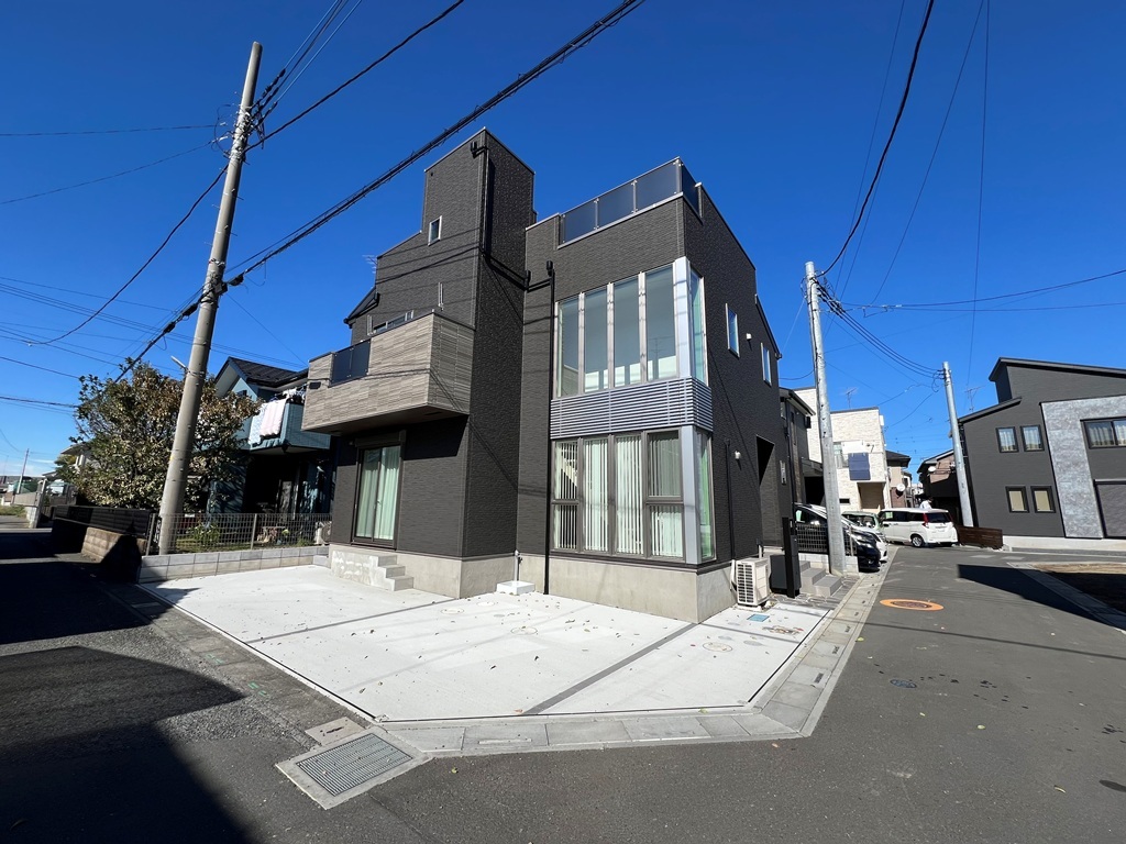 ベランダ部分にシースルーパネルをアクセントにいれ、すっきりとした印象の外観に仕上げた戸建て物件です。また、駐車スペースはお車が2台がゆったりと駐車することができる設計配置となっております。