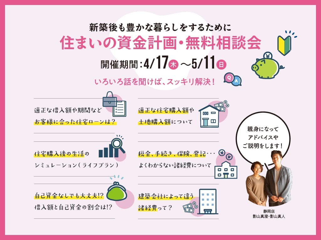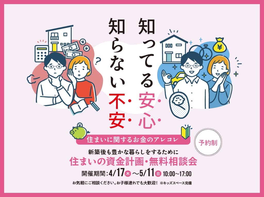 | タイトル | 【住まいの資金計画・無料相談会】~新築後も豊かな暮らしをするために★予約制★ |