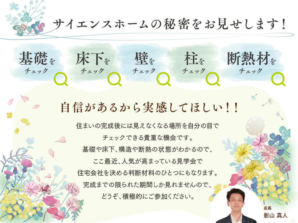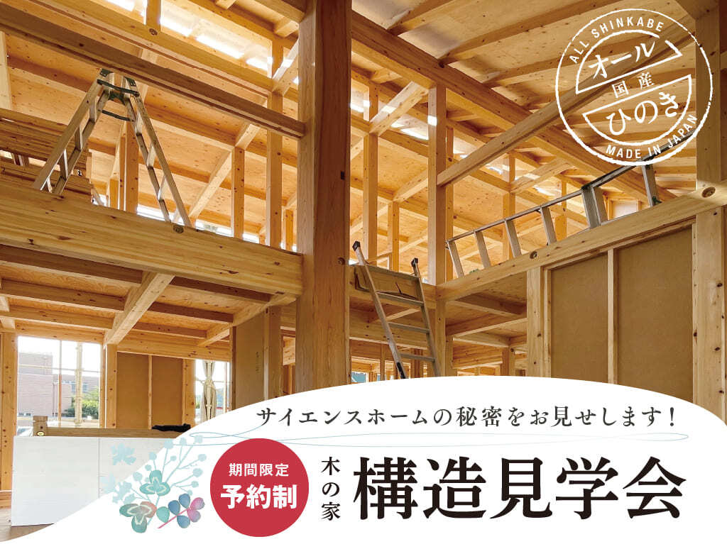 サイエンスホームの木材や構造を実際に見て体感してみてください。家が建つと隠れてしまう構造部分も自信があるからお見せできます!お家づくりに関する疑問や不安を解消する絶好の機会。構造見学会は限られた期間しか開催されませんので、この機会にぜひご参加ください。