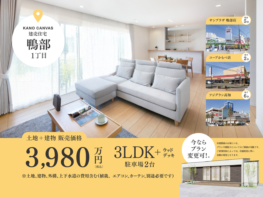 所在地/高知県高知市鴨部1丁目179番1、179番22、建ぺい率/60%、容積率/200%、地目/宅地、用途地域/第一種住居地域、都市計画区域(市街化区域)、道路/幅員10.47m、接道面/北5.38m、構造/木造平屋建て、入居時期/令和8年7月末予定、取引態様/売主、建築確認番号/第R07確認建築高知建技00134号
