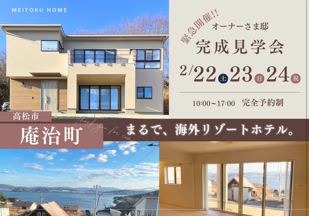 | タイトル | 緊急開催!瀬戸内を望むリゾート地にて オーナー様邸完成見学会in高松市庵治町 |