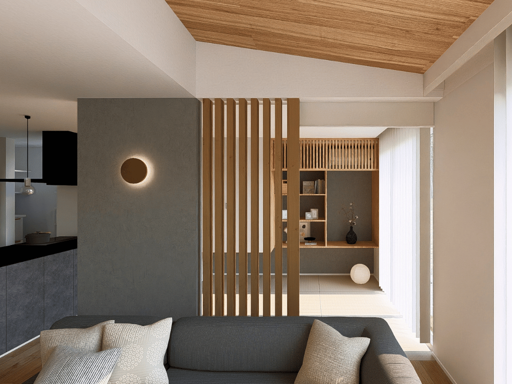 各部屋に必要な収納を計画し、生活動線をすっきり整えた間取り。格子や木目のデザインが、機能性の中に温かみを添えています。