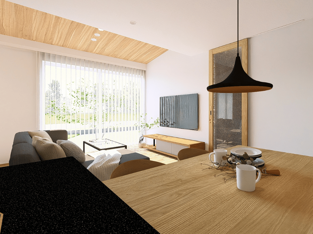 勾配天井と大きな窓からの光が明るさと開放感を演出。キッチンからリビング全体を見渡せる間取りで、家族の時間を大切にできる空間です。