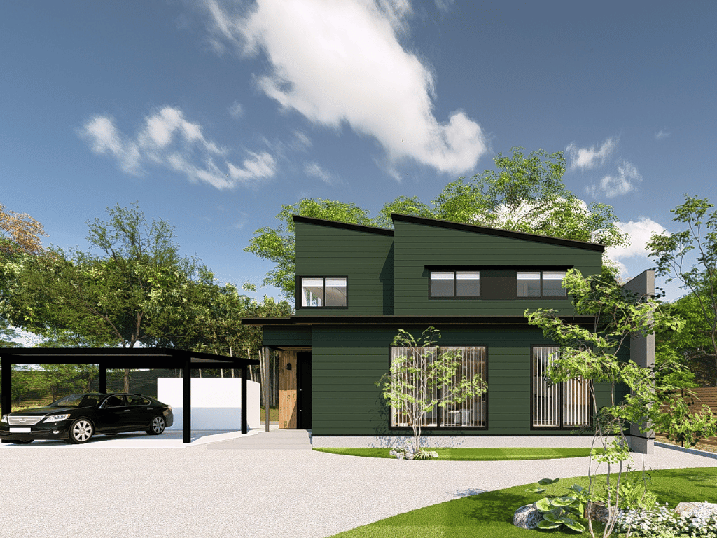 片流れ屋根と水平ラインが印象的なシルエット。落ち着いたカラーが街並みに調和し、シンプルながらも上質な印象を与えます。