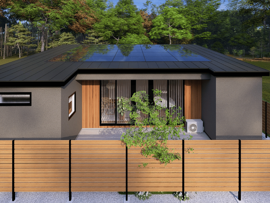 深い軒と木目の外壁が印象的な、上品で落ち着いた佇まい。ソーラーパネルを搭載しながら、デザイン性と機能性を両立させています。グレーの塗り壁と木の質感が美しく調和し、植栽とのバランスも心地よい外観です。