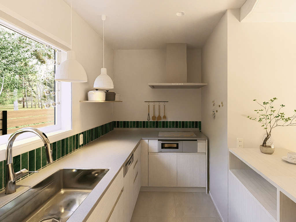 白を基調にグリーンのタイルがアクセント。窓から差し込む自然光の中で、気持ちよく料理を楽しめます。使い勝手と美しさを両立したL字型キッチンは、並んで立っても窮屈にならない心地よい距離感。