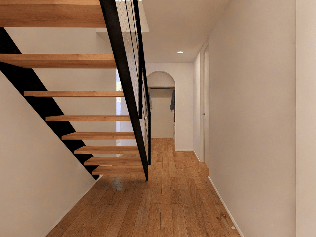 こだわったのは、プライバシーを守りながらも、家族の気配をほどよく感じる間取り。廊下で生活にメリハリをつくり、吹き抜けで開放感とつながりを両立させました。