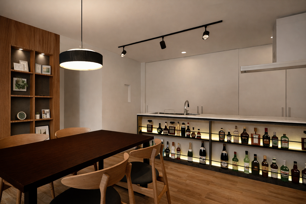キッチンに立つ時間も、リビングでくつろぐ時間も。並んで料理をしたり、ゲームを楽しんだり。キッチン前のウイスキー棚は、収納ではなく“飾る”という魅せ方。