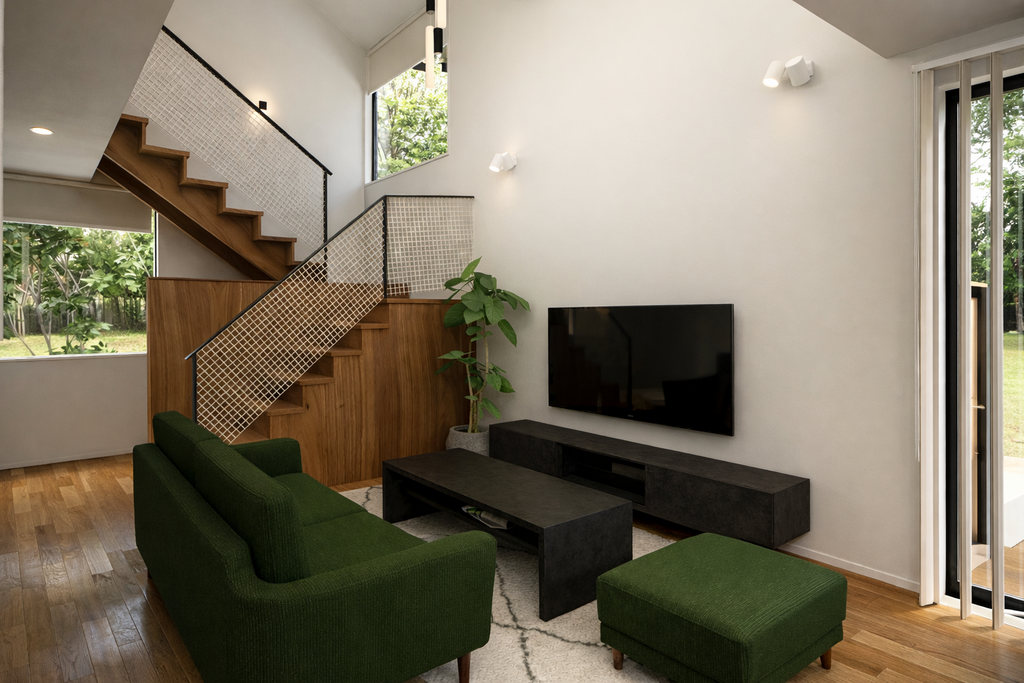 大きな窓から光が入り、吹き抜けが空間にやわらかな広がりを生みます。ソファに座っていても、キッチンに立っていても、2階にいる家族の気配が感じられる設計。ただ広いだけではなく、安心感のある開放感です。