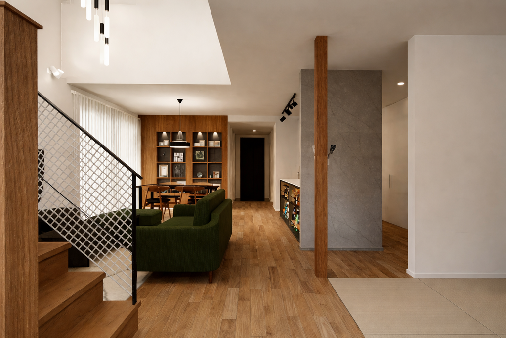 段差を抑え、LDKから和室へと自然につながる間取り。脱衣室と洗面室を分けた水まわり設計で、忙しい朝もスムーズに。毎日の小さなストレスを減らすことを大切にしました。派手さではなく、使いやすさを優先した住まいです。