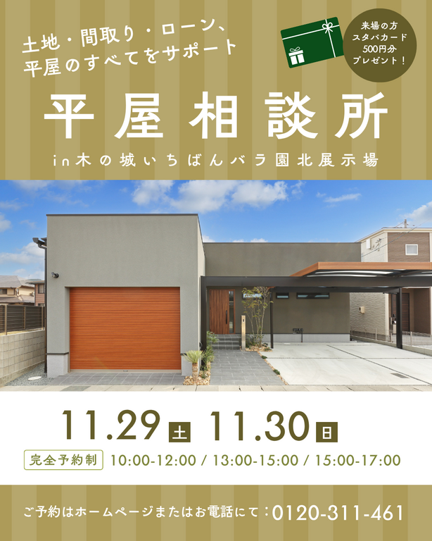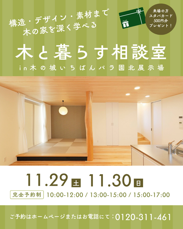 自然素材住宅のプロに聞く理想の暮らし方「木と暮らす相談室」を11/29(土)・30(日)の2日間、木の城いちばんバラ園北展示場にて開催させていただきます。