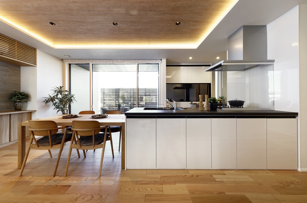キッチンを中心に回遊できる動線設計と、横並びのダイニングテーブルで家事もスムーズに。
