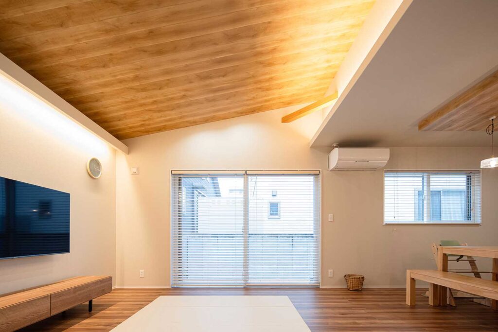 リビングには、杉無垢の床と四国杉の上がり天井を採用。