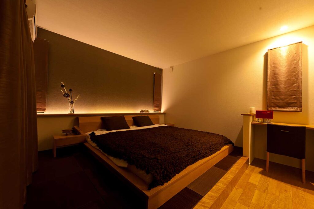 間接照明が穏やかな光で壁を照らし、