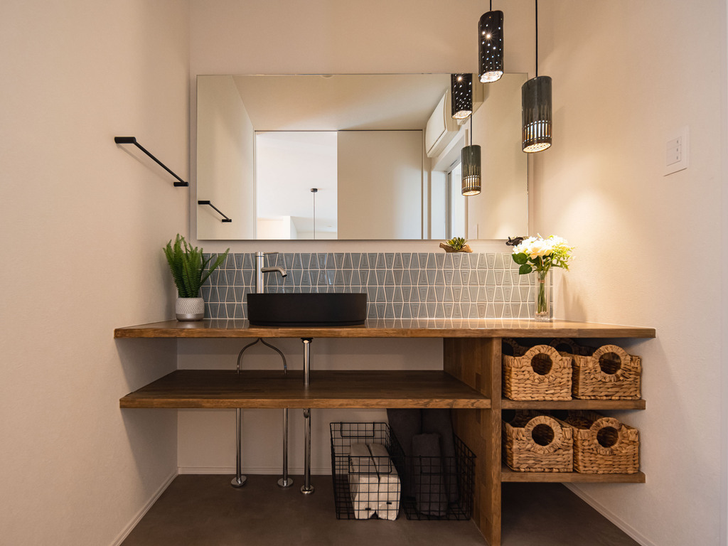また、照明や洗面ボウルはダークトーンで統一し