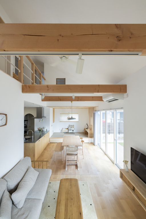 化粧梁のある吹き抜けと木の質感を生かした内装を。
