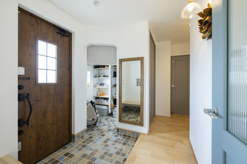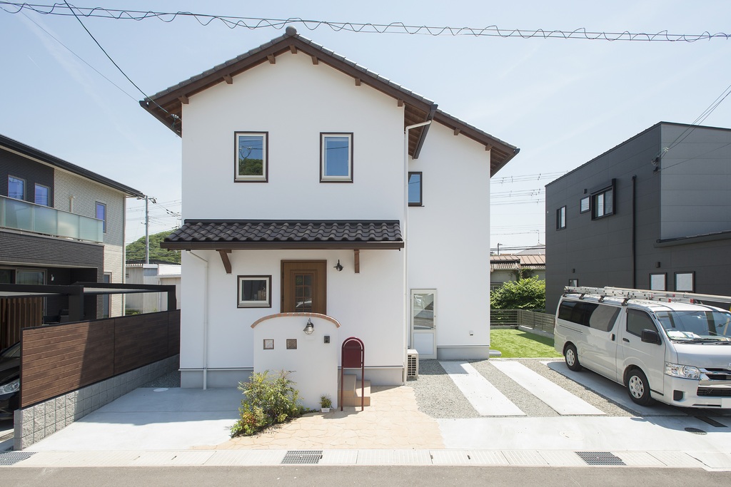 ブラウンの洋瓦の三角屋根に、しっくいの真っ白な外壁の映える、大人可愛い外観のお家がこの度完成しました。