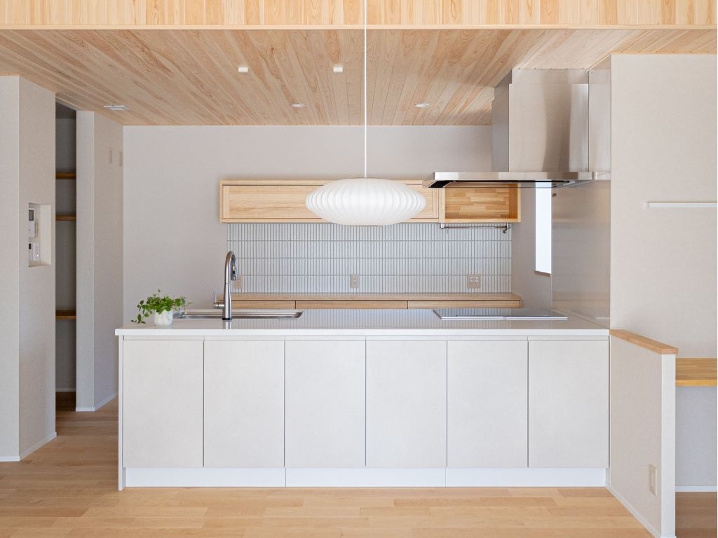 キッチンを彩る、美しい板張り天井