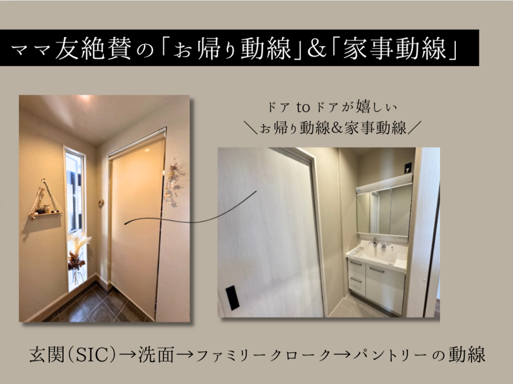 玄関(SIC)→洗面→ファミリークローゼット→パントリーへと続く“ドアtoドア”のスムーズなつながり。