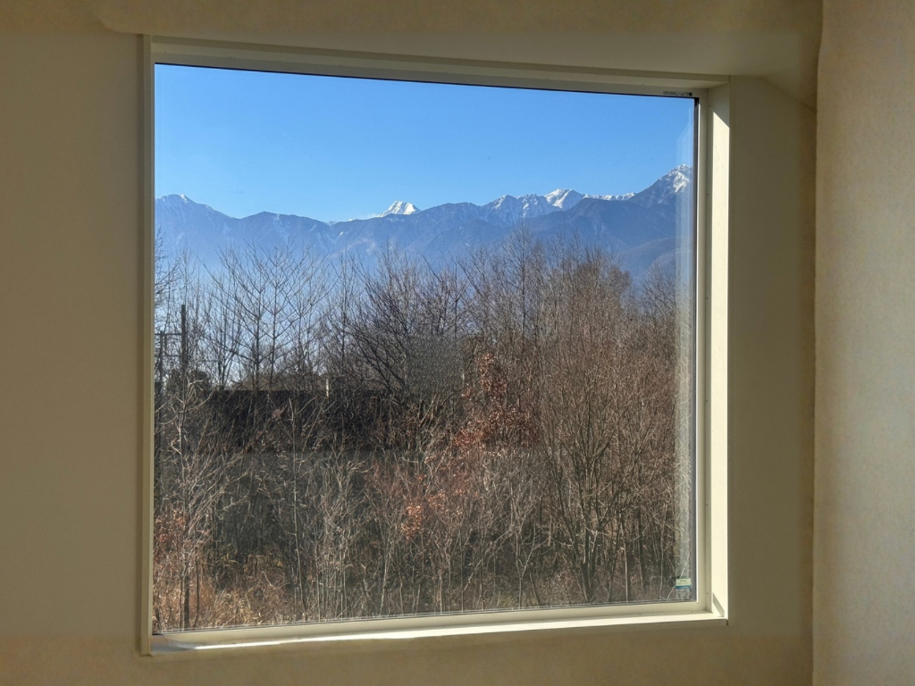 2階の窓の向こうには、額装された絵画のような甲斐駒ヶ岳の雄姿が広がります。冬の凛とした空気の中で輝く雪山、夕暮れに染まる稜線……。この景色こそが、この家で最も価値のあるインテリアです。