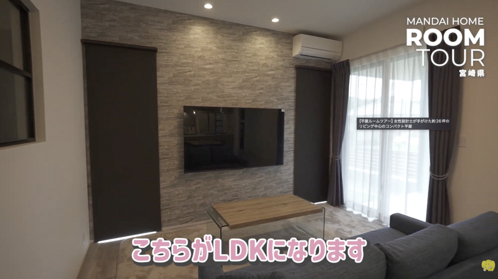 空間がより広く感じられるだけでなく、エアコンをすっきりと綺麗に格納しています。 奥様のご希望で玄関と繋がるお洒落な室内窓を設けており、光を取り込みつつ、さらに広がりを感じられる工夫が施されています。