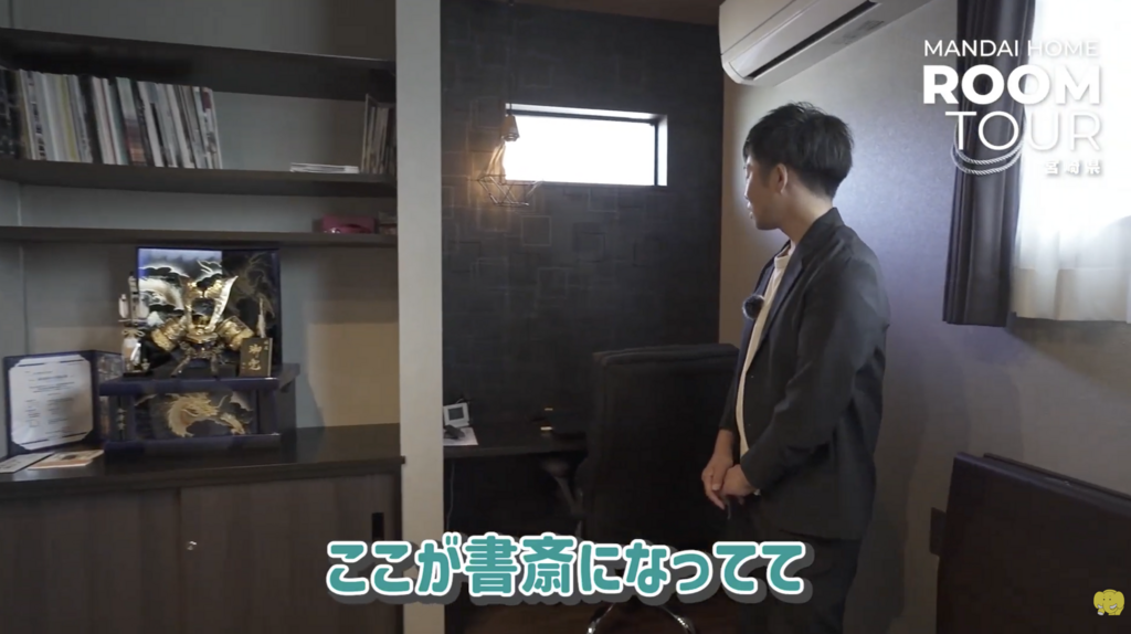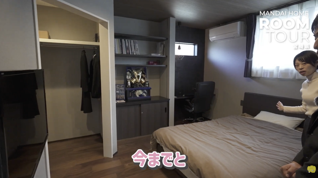 寝室はグレーの壁紙と木目の天井を採用し、他の部屋とは雰囲気を変えた落ち着いた大人なトーンに。 ミニカーなど、ご主人の趣味を存分に楽しめる書斎スペースも完備しており、男のロマンが詰まったお部屋になっています。