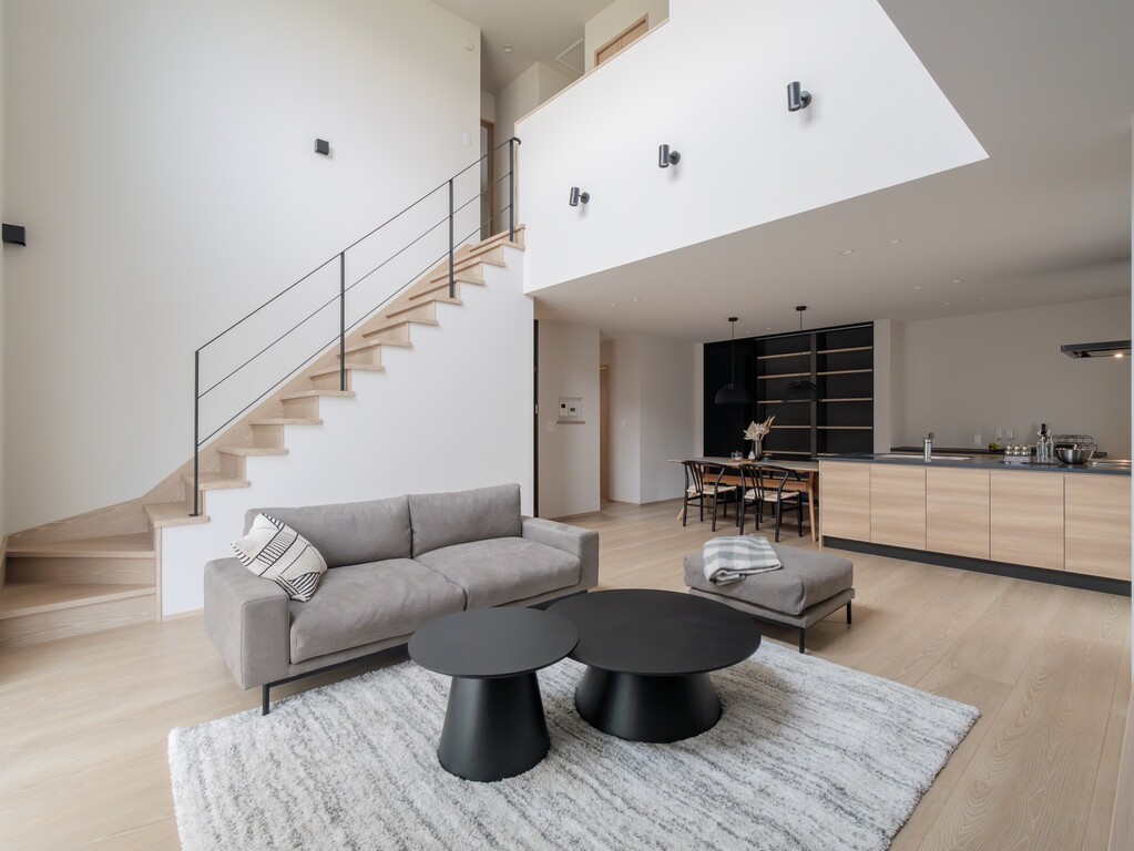 開放感を演出する、吹き抜けとオープン階段を備えた25帖のLDK