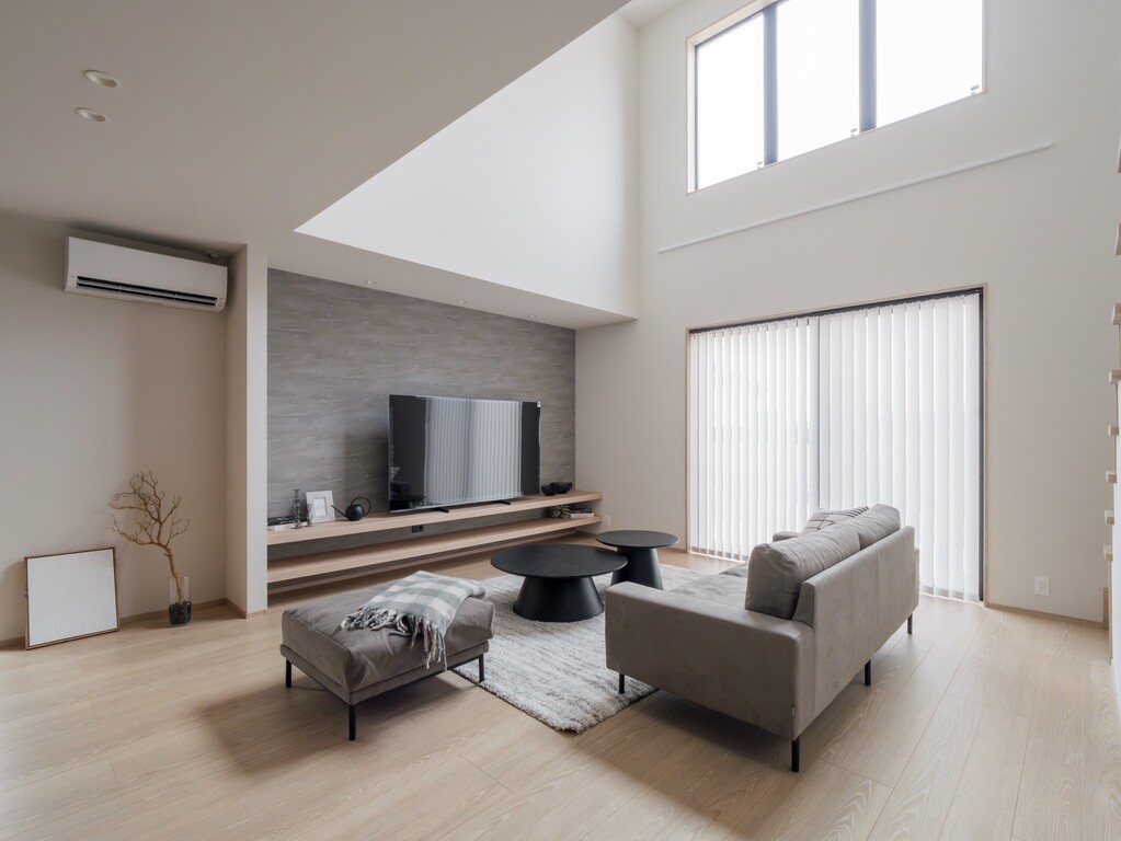 天井が高くゆとりあるリビング空間には、自然光を取り込む吹き抜けとオープン階段を採用いたしました。テレビボードやソファが美しく映え、ご家族皆様が心地よく過ごせるくつろぎの場をご提案いたします。