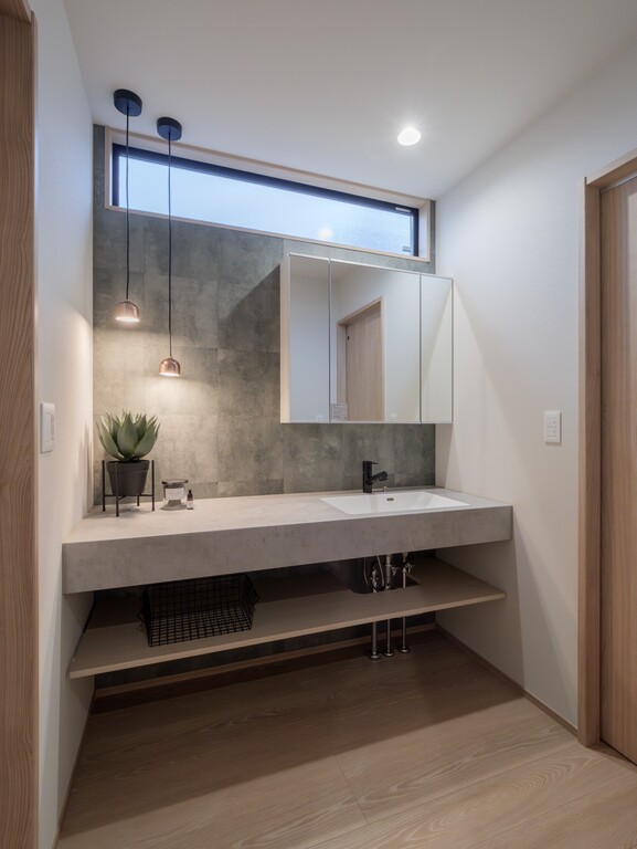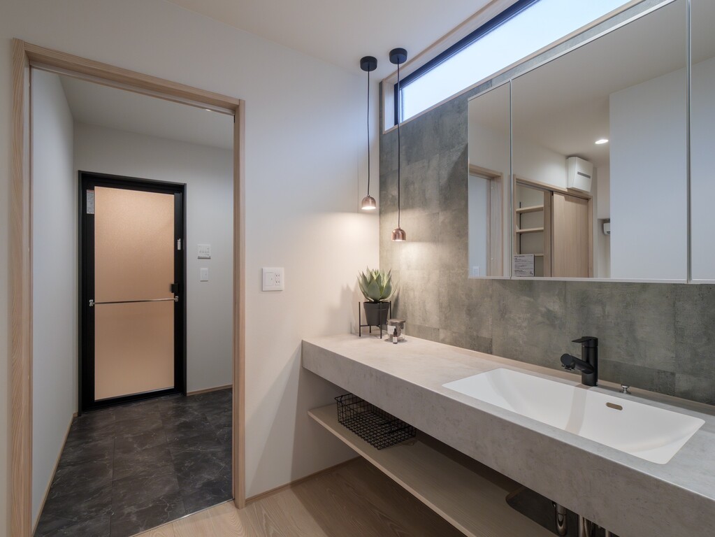 ペンダントライトが優しく照らす洗面室には、高級感のある石目調カウンターとミラーキャビネットを採用しております。上品な設えにより、毎日の身支度をより豊かな時間へと導きます。