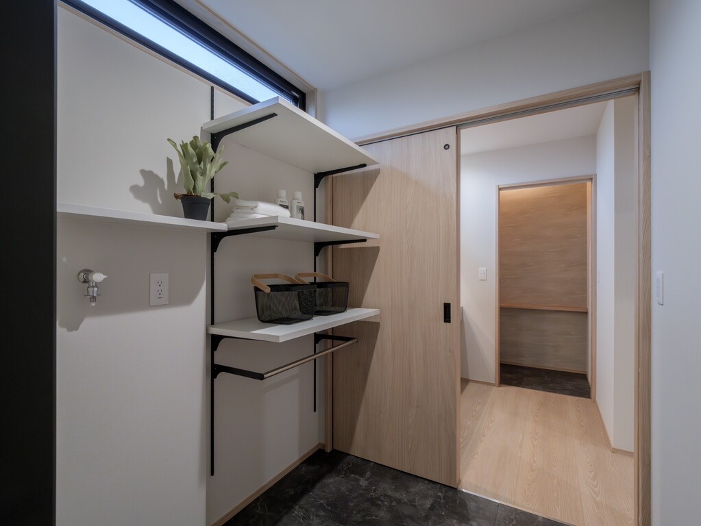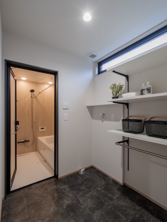 トイレから洗面、脱衣室、浴室へとスムーズに繋がる、効率的な水回り動線を確保いたしました。スレートタイルの床がモダンなランドリースペースには使い勝手の良いオープン棚を備え、家事のしやすさとデザイン性を高い次元で両立しております。その使い心地を、ぜひご自身の目でお確かめくださいませ。