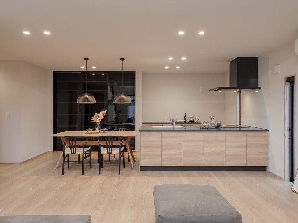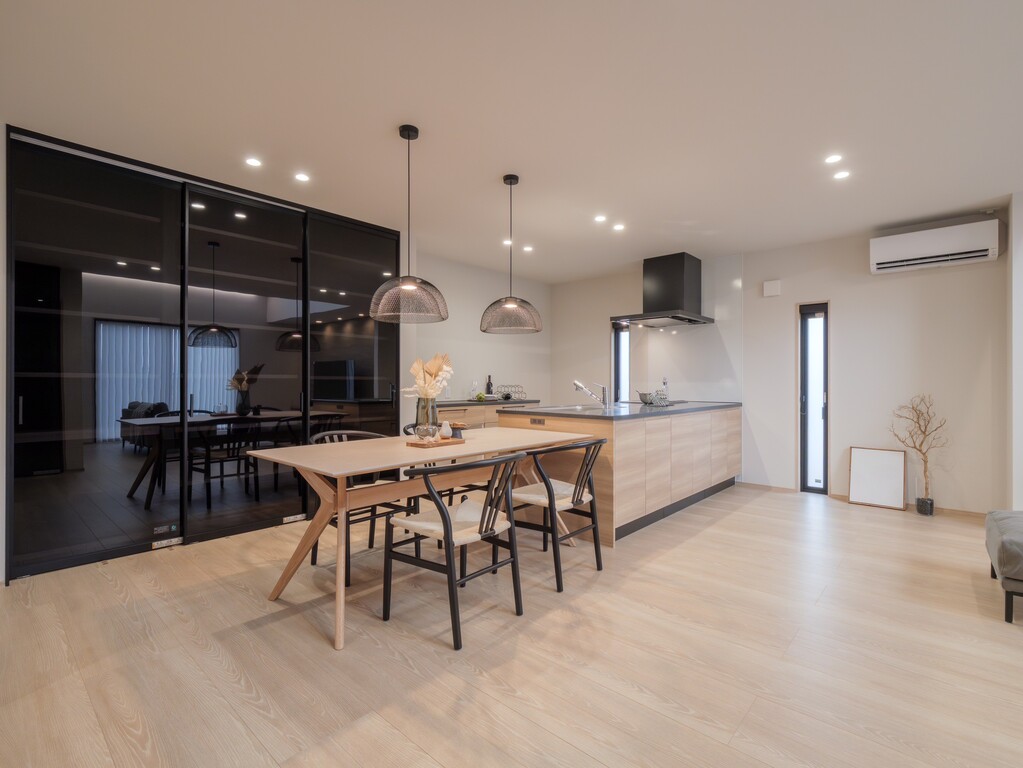 黒ガラスの間仕切りをアクセントに用いた、ダイニングとキッチンを見渡せる開放的な間取りとなっております。ブラックのレンジフードと温かみのあるウッドキャビネットが調和する、洗練されたスタイリッシュなキッチン空間を実現いたしました。