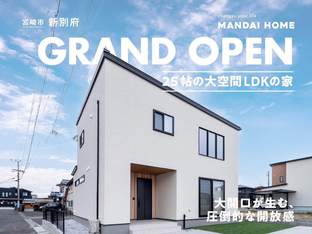 宮崎市新別府町にグランドオープンいたしました、ジャパンディテイストのモデルハウスです。 広々とした25帖の大空間LDKをはじめ、毎日の暮らしに開放感とゆとりをもたらすアイデアが満載となっております。 皆様のご来場を心よりお待ち申し上げております。