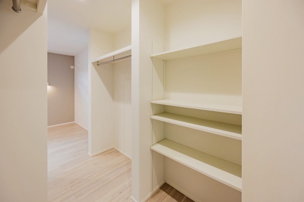 ランドリールームから主寝室までがつながる間取りで、家事ラク動線を実現しています。主寝室までつながることで、家事のハードルがぐっと下がります。クローゼットは、家族で使ってもよし、夫婦のものを収納してもよし。家族によって用途を変えられます。