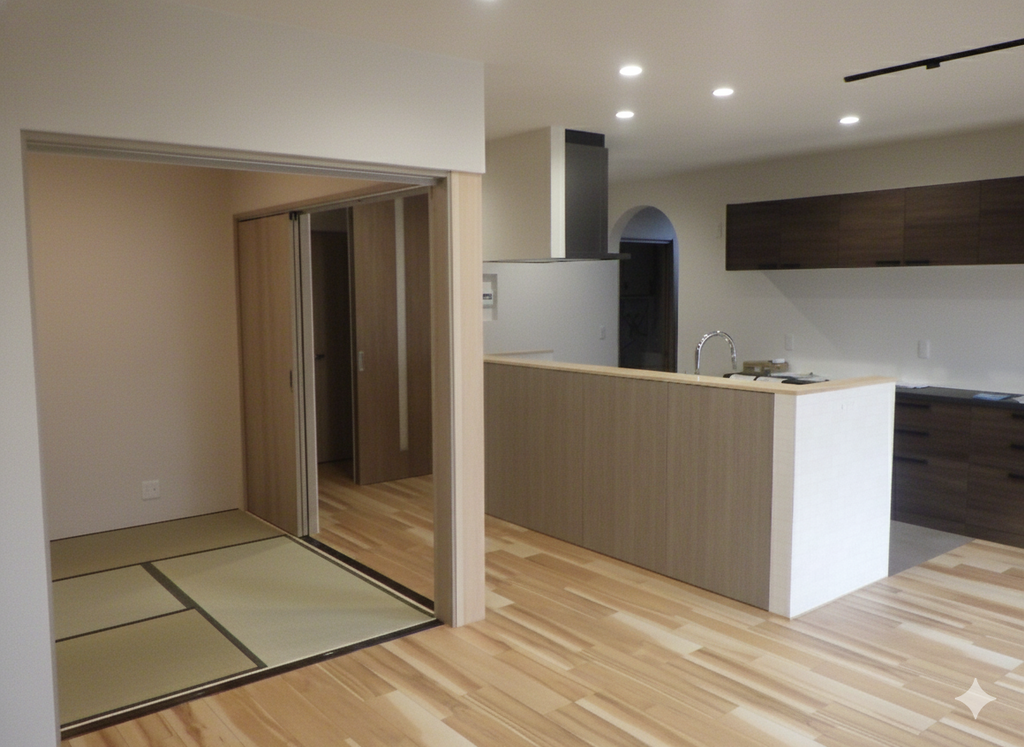 広々とした空間は家族が集まって過ごすのに最適です。コミュニケーションが行き交う空間と和室のつながりを意識した空間づくりとなっています。おしゃれなインテリアを取り入れて、お家時間をより楽しいものにしましょう。