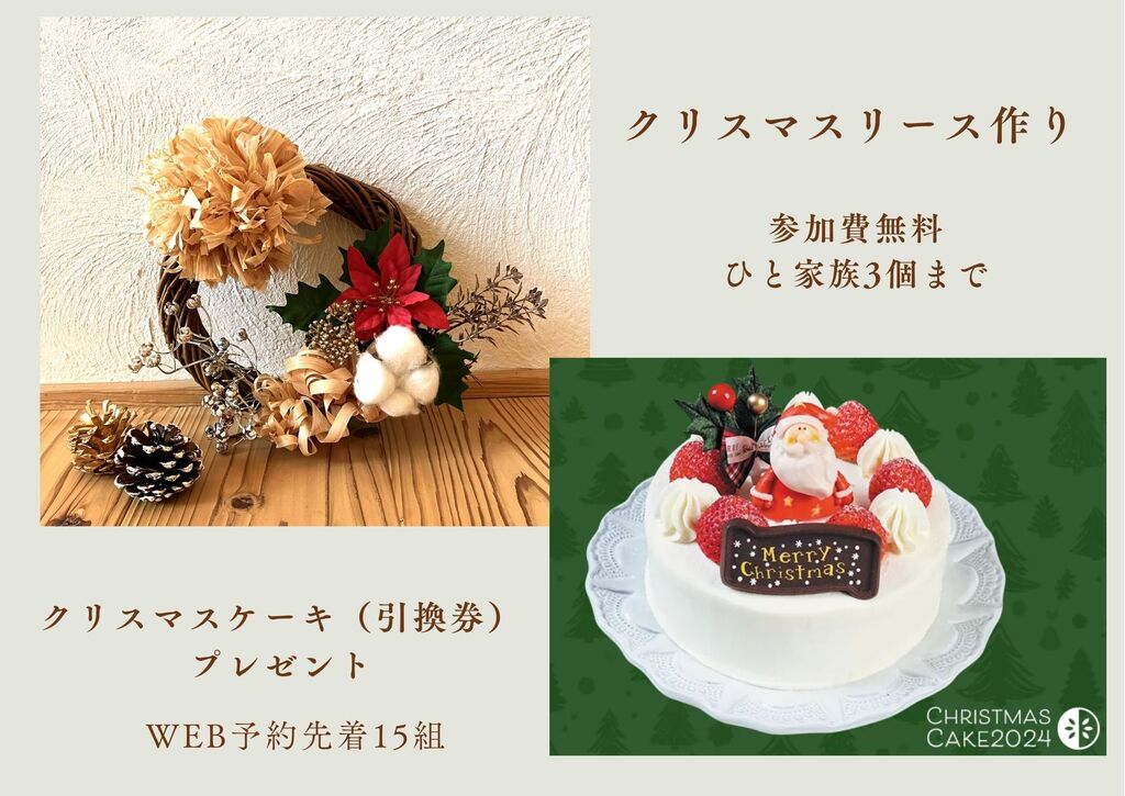 お楽しみイベントとして、クリスマスリースづくりや、ケーキ&ドリンクもご用意しております、どうぞお気軽にご参加ください。