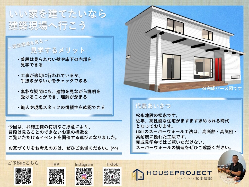 今回は、お施主様の特別なご厚意により、普段は見ることのできないお家の構造をご覧いただけるイベントを開催する運びとなりました。