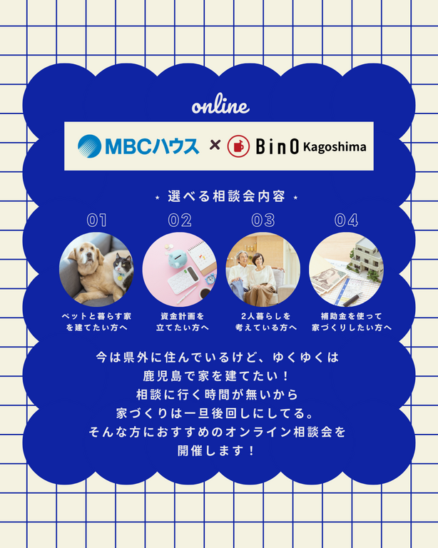 | タイトル | 【相談会】『自宅で気軽に家づくり』2月限定 月間イベント MBCハウス&BinO オンライン相談会 |