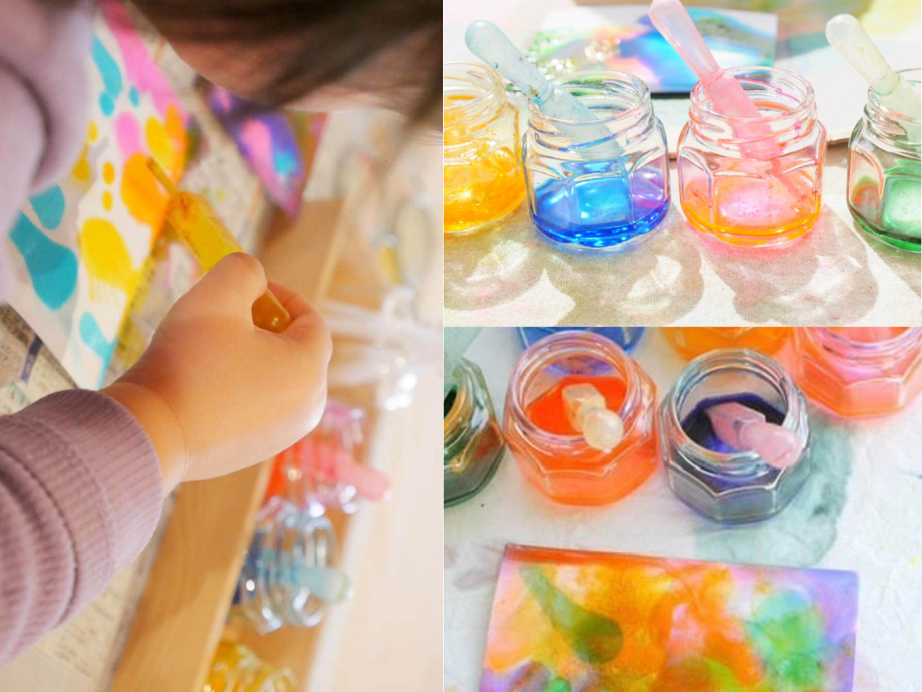 赤と青を混ぜたらなに色になるかな?こどもは色を混ぜるのが大好き!色の実験をしたら作った色で作品を作ろう!