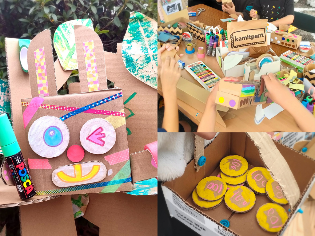 小さめのダンボール箱1つで何作ろう??パーツを付けたりペンで描いたり、動物・乗り物・入れ物など…なんでも好きなものに変身!