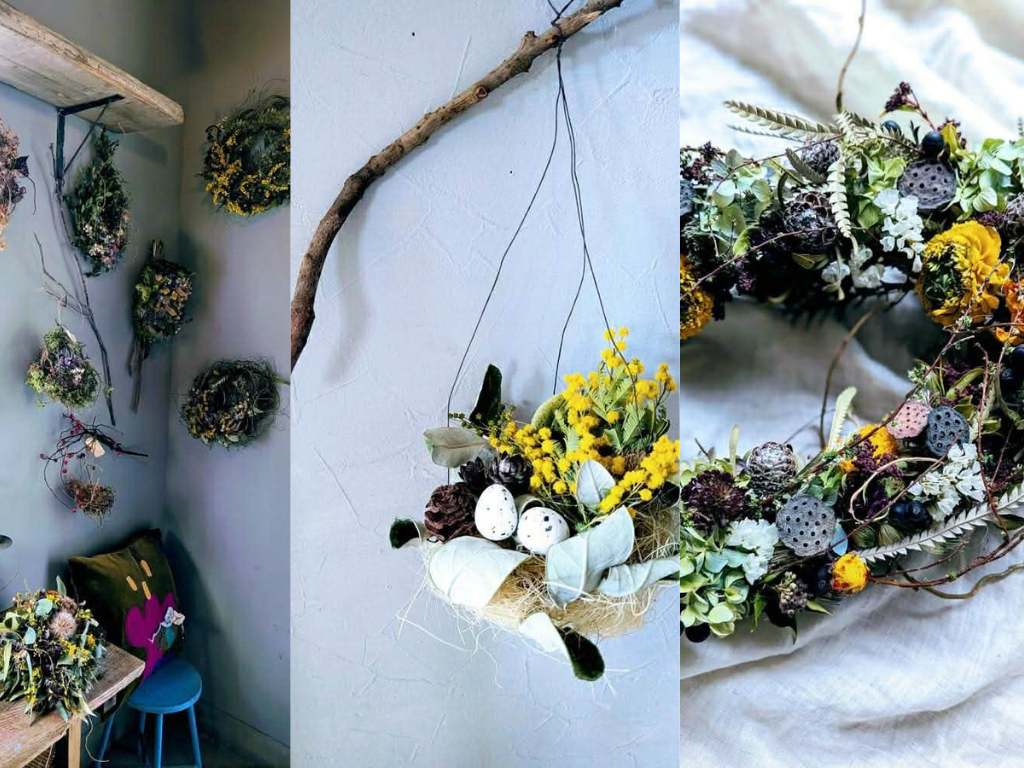 植物たちを、乾いても植物らしく自然に近い状態で生き生きと表現できたらと思いながら、1つ1つリースなどあらゆるカタチにしています。
