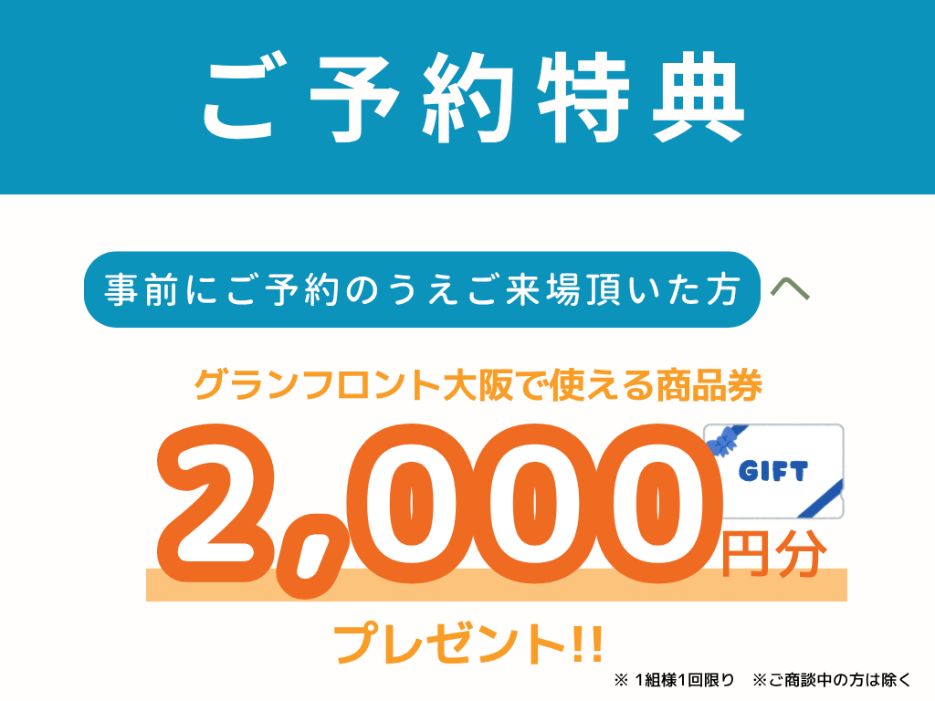 事前にご予約いただいた方限定で、グランフロントで使える商品券2,0000円分をプレゼント!!
